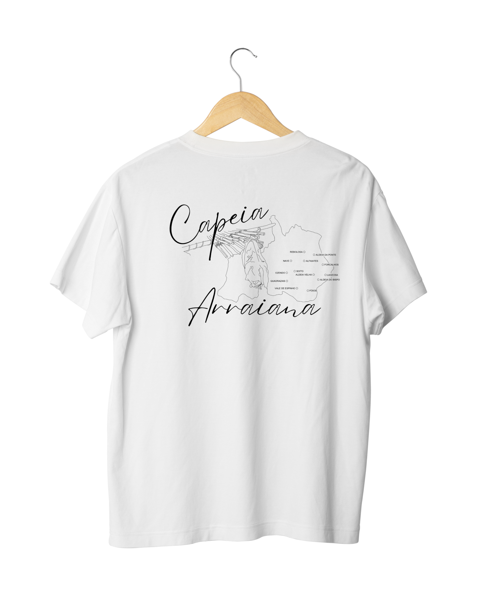 Confeccionada em algodão orgânico de alta qualidade, tem um design exclusivo com bordado vermelho no peito esquerdo e impressão nas costas, com as localidades onde se fazem as capeias arraianas. A t-shirt permite uma personalização única, onde podes preencher cada localidade com linha em ponto cruz à medida que as capeias acontecem, criando uma forma única de celebrar e registar as capeias do mês de agosto.
