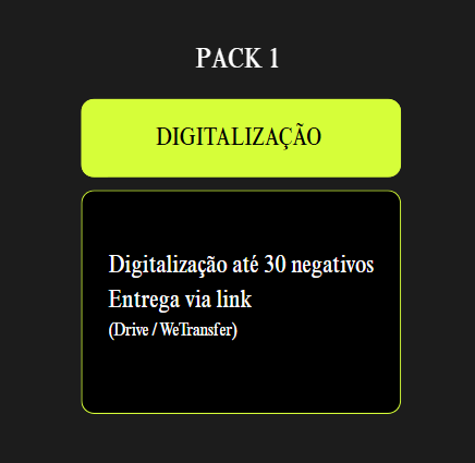 PACK 1 — DIGITALIZAÇÃO (ENTREGA VIA EMAIL/LINK) 18,00 € Desconto de %. IVA incluído. Inclui: Digitalização até 30 negativos Entrega via link (Drive / WeTransfer) Ler mais Voucher | Digital Voucher | Cartão Físico - 3,00 € Pen Extra - 5,00 € Impressão adicional 5 fotos - 5,00 € Impressão adicional 10 fotos - 10,00 € Álbum digital organizado - 5,00 € Quantidade Comprar Contactar Partilhar
