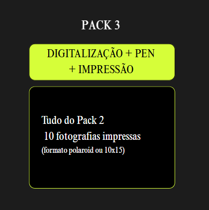 PACK 3 — DIGITALIZAÇÃO + PEN + IMPRESSÃO 40,00 € Desconto de %. IVA incluído. Inclui: Tudo do Pack 2 10 impressões premium (formato polaroid ou 10x15) Ler mais Voucher | Digital Voucher | Cartão Físico - 3,00 € Pen Extra - 5,00 € Impressão adicional 5 fotos - 5,00 € Impressão adicional 10 fotos - 10,00 € Álbum digital organizado - 5,00 € Quantidade Comprar Contactar Partilhar